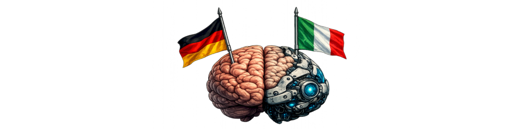 Symbolbild: zwei Gehirnhälften: eine Hälfte zeigt eine Roboter-Andeutung. In einer Gehirnhälfte steckt eine deutsche Flagge, in der anderen eine englische Flagge.