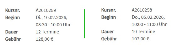 zweiter Kurs: Für viermal im Monat mit jeweils 60 Minuten Unterricht – insgesamt vier Stunden im Monat: 42,80 EUR.